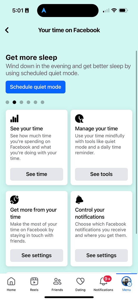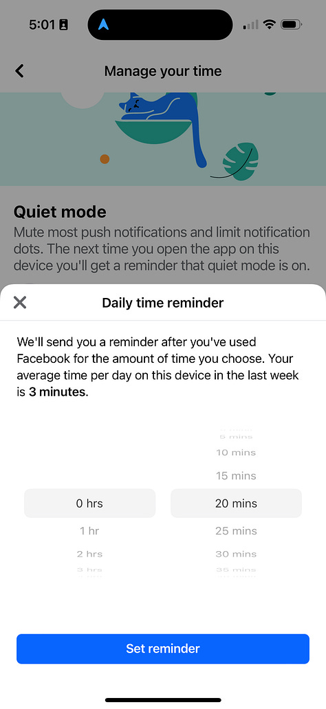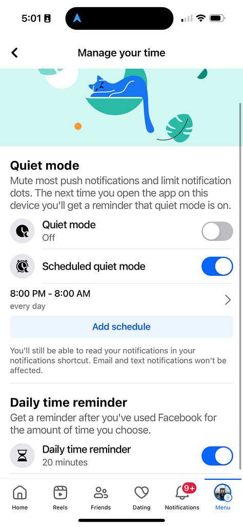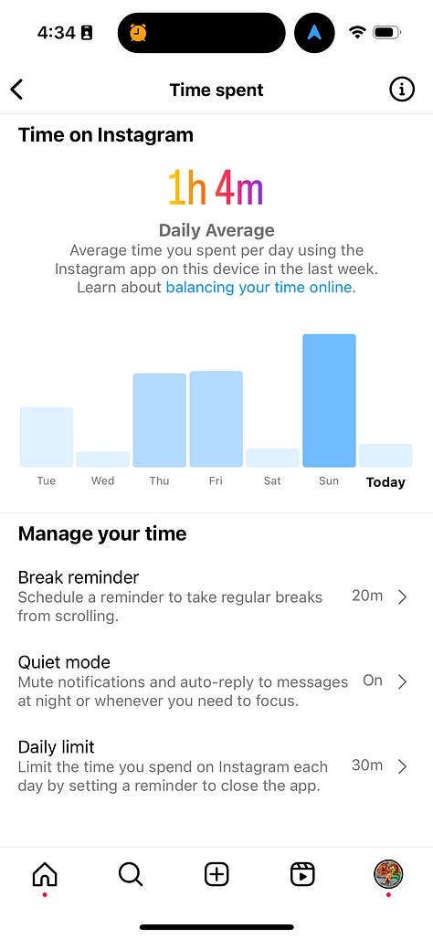 My top practical tips for protecting your mental health on social media — especially if you have ADHD — are: set break reminders, quiet mode [with auto-reply to messages], and daily limits on any app that allows you [Instagram, TikTok, Facebook]!