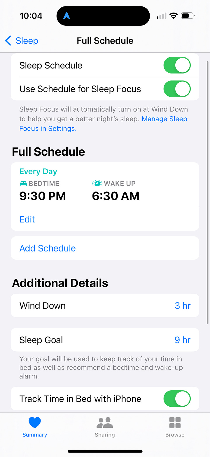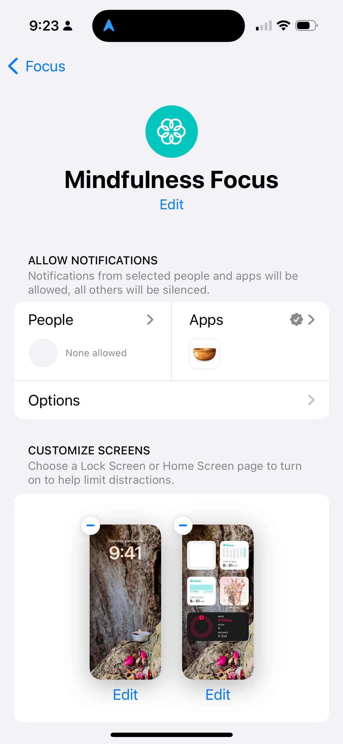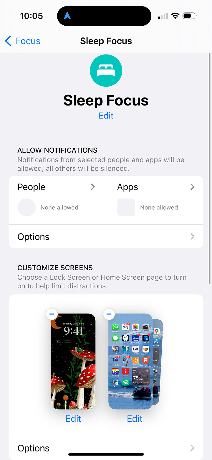 I also have a Sleep Schedule set on my iPhone, pausing ALL notifications starting 3 hours before I go to bed every night so I can properly wind down with my sleep hygiene ritual… and for the first 1.5 hours that I wake up so I don’t get sucked into a doomscroll first thing when I wake. This has been CRITICAL as I recovered from severe burnout.